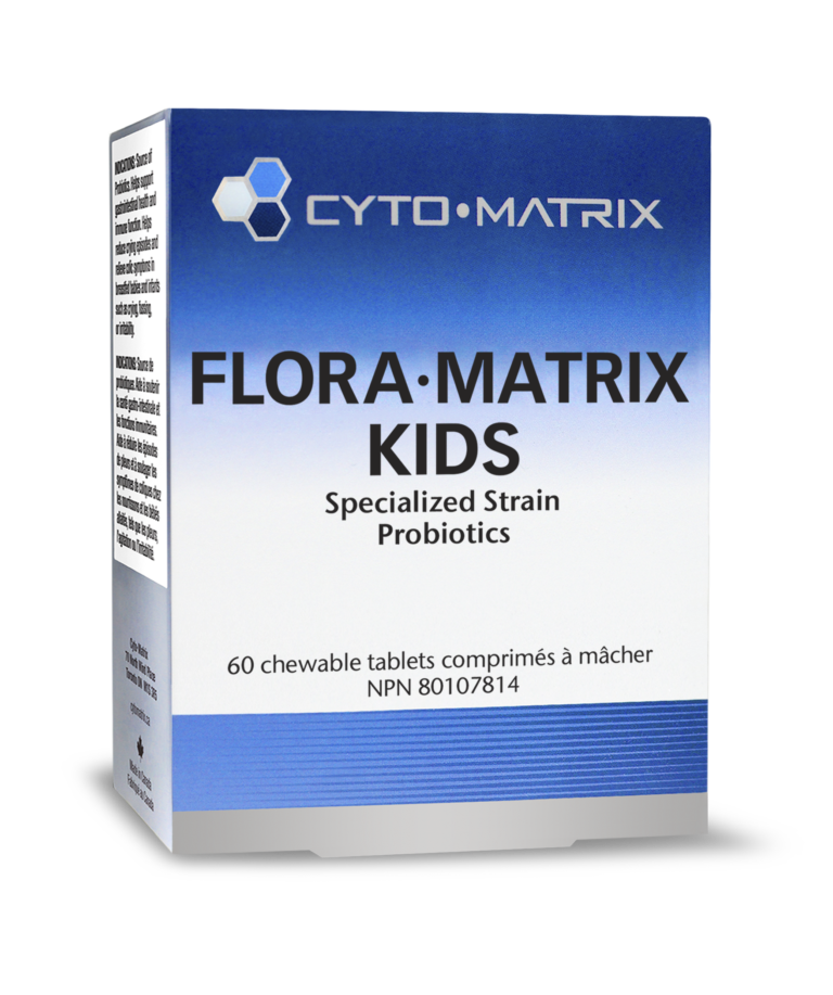 Flora-Matrix Kids de Cyto-Matrix offre 5 milliards d'unités de colonies par comprimé à croquer, contenant des parts égales de La-NCFM et de Bi-07. Ces souches fondées sur des preuves aident à réduire les symptômes du rhume et de la grippe, tels que la fièvre, l'écoulement nasal et la toux, réduisant ainsi les jours d'école manqués en raison de la maladie et des prescriptions d'antibiotiques. Flora-Matrix Kids contient également de la vitamine A, de la vitamine C et de la vitamine D3 pour un bon fonctionnement immunitaire et pour favoriser le développement d'os et de dents solides. Flora-Matrix Kids est livré dans un délicieux comprimé à croquer à saveur de baies naturelles qui est de longue conservation et certifié sans produits laitiers. Chaque boîte contient 60 comprimés sous forme de blister.